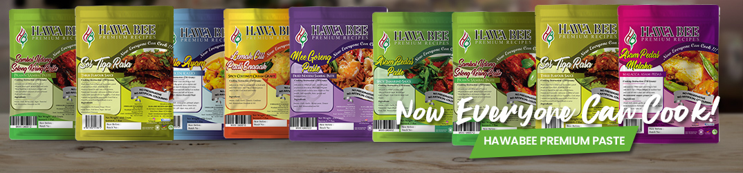 For the first time, Hawa Bee family secret recipes is now made available by her son, Nazir Khan Bin Rahim Khan through 11 Hawa Bee Premium Paste.Home-Cook delicacies with a surprising twist of taste within minutes. Just add water to the paste and mix with your meat/fish/chicken and its done! No more hassle of having to add certain seasoning or ingredient. Hawa Bee Premium Paste is 100% ready-to-cook!